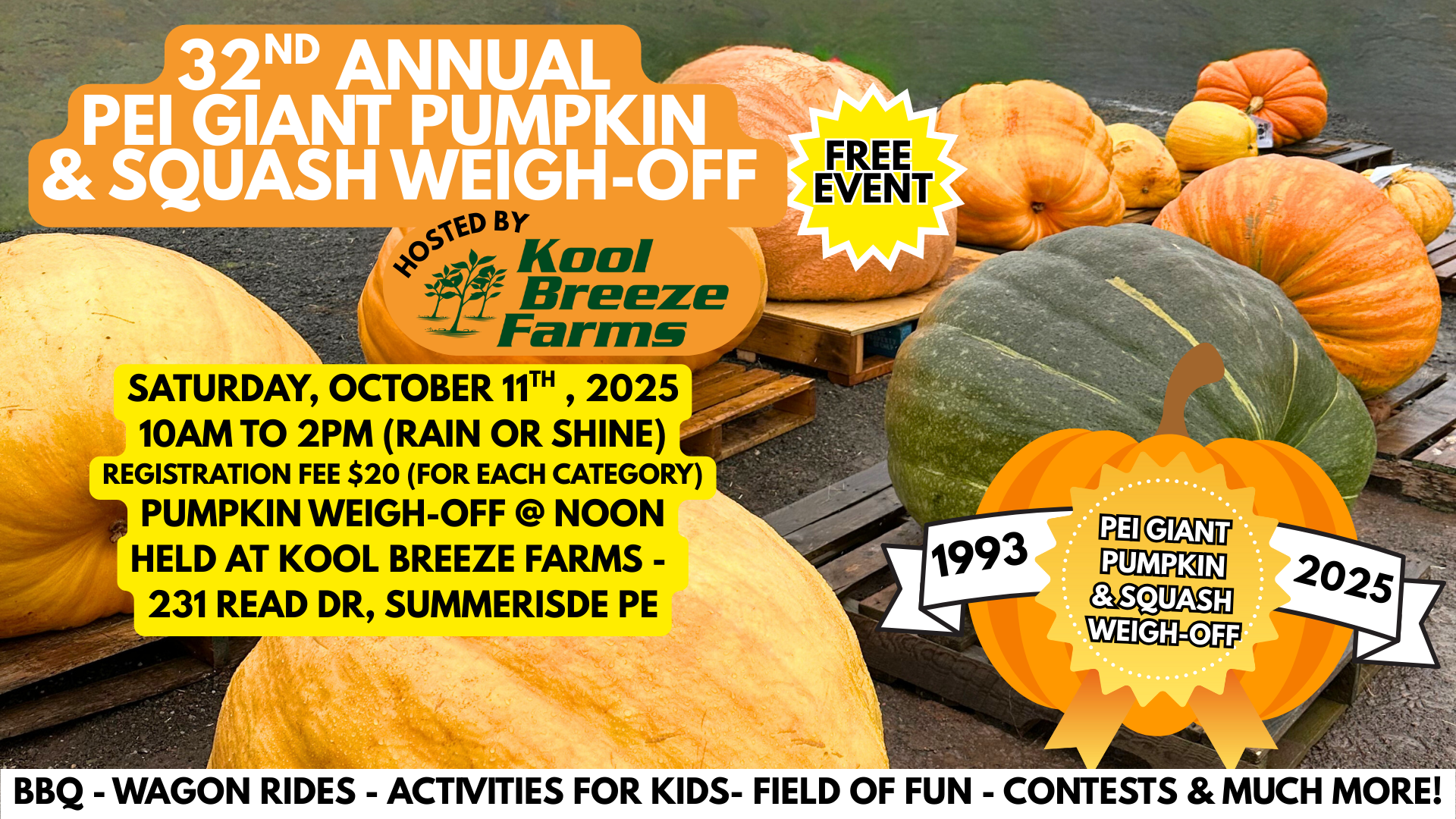 On Saturday, October 11th Kool Breeze Farms is hosting the 32nd Annual PEI Giant Pumpkin & Squash Weigh-Off!