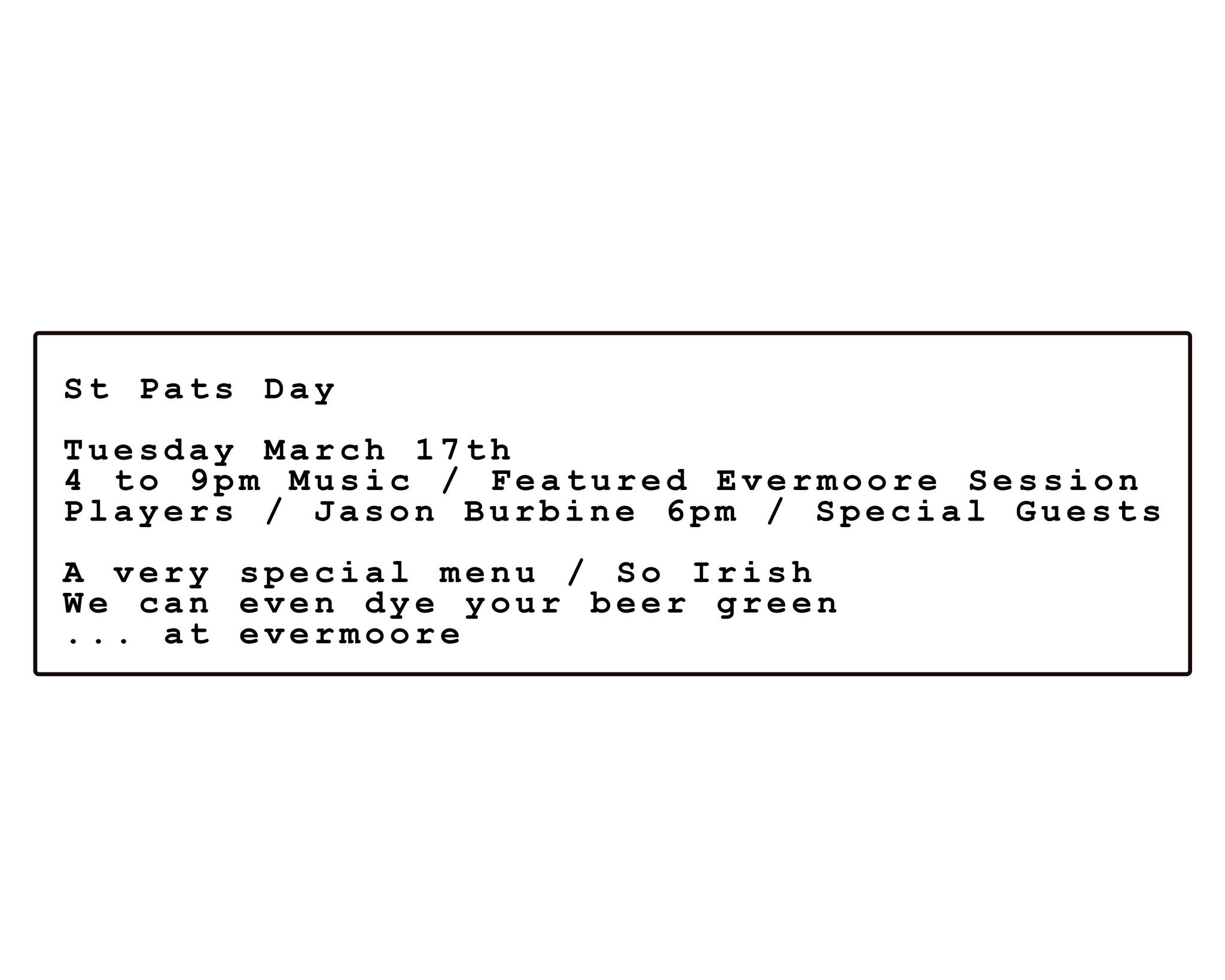 Grab some friends, reserve a table if you’d like, and come celebrate St. Patrick’s Day with us at Evermoore. Sláinte!