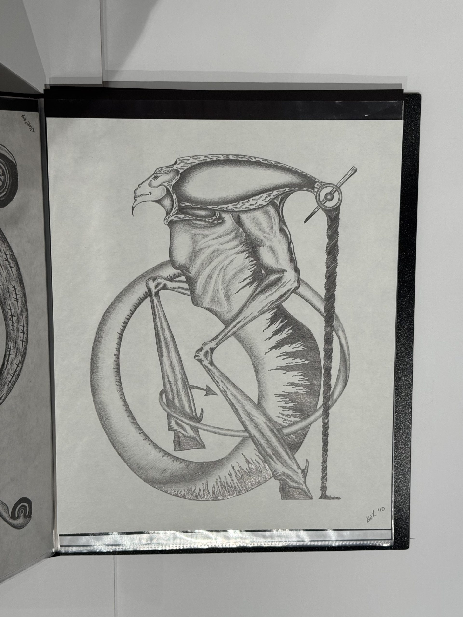 The exhibition features intricately carved heirloom boxes, miniature houses, walking canes, wind catchers, black-and-white sketches, and hooked rugs. Leard’s imagery often explores mythical and surrealist themes, drawing inspiration from biomechanical artists such as H.R. Giger.